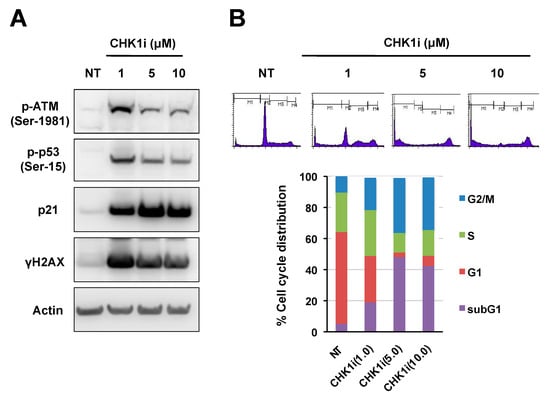 To confirm that CHK1i activates the ATM-p53 signaling axis by inducing DSBs at the doses employed here, we examined expression of the histone variant γH2AX, which is a marker of DSBs. Indeed, γH2AX levels were markedly upregulated in NB-39-nu cells exposed to 1–10 μM CHK1i (PF-477736), and a similar pattern of dose dependence was observed for p-ATM-Ser1981, p-p53-Ser15, and p21 levels (Figure 3A). In keeping with the inverse dose dependence, flow cytometric analysis of the cell cycle distribution revealed that 5 and 10 μM of CHK1i (PF-477736) resulted in massive apoptotic cell death, as detected by the increasing size of the sub-G1 population (Figure 3B) [27]. Furthermore, cell viability analysis showed that the increasing size of the sub-G1 population is likely to be associated with growth inhibiting effect by CHK1i (PF-477736) (Figure S4). Consistent with previous studies, high levels of basal γH2AX were observed in the CHK1i-sensitive SMS-SAN cell line compared to the NB-39-nu cell line [28]. These results indicate that CHK1i induced DSBs might trigger the DNA repair pathway through ATM-p53-p21 for cell survival in the CHK1i-insensitive NB-39-nu cell line. However, exposure of NB-39-nu cells to 5 and 10 μM CHK1i (PF-477736) were excessively cytotoxic, and thus DNA repair machinery might be unable to prevent cell death.