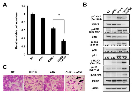 Combination treatment with CHK1 and ATM inhibitors induces NB-39-nu cell death. (A–C) NB-39-nu cells were treated with DMSO (NT), 0.175 μM PF-477736 (CHK1i), 10 μM Ku55933 (ATMi), or 0.175 μM PF-477736 plus 10 μM Ku55933 (CHK1i + ATMi). Cells were then harvested and analyzed for (A) alamarBlue cell viability assay, (B) protein expression by immunoblotting at 7 days after indicated treatments, or (C) Giemsa staining and microscopy at 6 days after indicated treatments. In (A), the graphs were plotted using the values from four independent experiments. Data are presented as the mean ± SD. * p < 0.05. cl-CASP3, cleaved caspase-3; PARP, poly (ADP-ribose) polymerase. In (B), Representative numbers were normalized to the intensity of the indicated bands. In C, black arrows indicate the examples of cell shrinkage with disruption of cell–cell contacts.