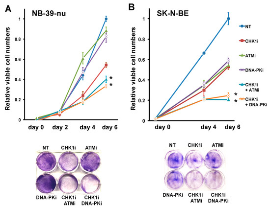 Combination treatment with either ATMi or DNA-PKi sensitizes NB cells to CHK1 inhibition. (A) CHK1i-insensitive NB-39-nu cells and (B) SK-N-BE cells were treated with DMSO (NT) or the indicated combinations of 0.175 μM CHK1i (PF-477736), 10 μM ATMi (Ku55933), and/or 1 μM DNA-PKi (NU7441) for 6 days. At the indicated times, cells were harvested and analyzed for cell viability (upper panels) or Giemsa staining (lower panel). Data are presented as the mean ± SD of four independent experiments. * p < 0.05.