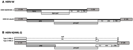 So far, a statistically significant correlation between HERV expression and a disease has been repeatedly and independently achieved only for HERV-W and multiple sclerosis (MS), while the reproduction of human diseases in transgenic animals was achieved for HERV-W and multiple sclerosis and for HERV-K and amyotrophic lateral sclerosis (ALS), as described below. The schematic structures of HERV-W and HERV-K(HML-2) elements are shown in Figure 1.