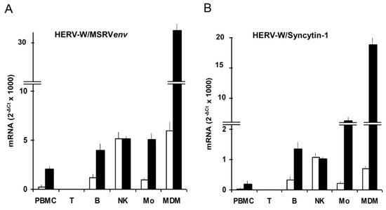 Expression of HERV-W/MSRVenv and HERV-W/Syncytin-1 mRNAs by PBMC subsets, as such and after exposure to the EBVgp350 protein. PBMC from HERV-W/MSRV(+) donors were tested as such, and after immunobeads separation in CD3+T, CD19+ B, CD56+/CD192/CD32 NK and CD192/CD3–/CD562 monocyte subsets; monocyte aliquots were also differentiated into macrophages (MDM). The cells were treated overnight with recombinant EBVgp350 protein, then were harvested and processed for mRNA extraction, reverse transcription and real time PCR with primers selective for HERV-W/MSRVenv and HERV-W/Syncytin-1, as published [43]. (A) HERV-W/MSRVenv. (B) HERV-W/Syncytin-1. Open bars: basal levels; black bars: mRNA levels of cells exposed in vitro to EBVgp350.
