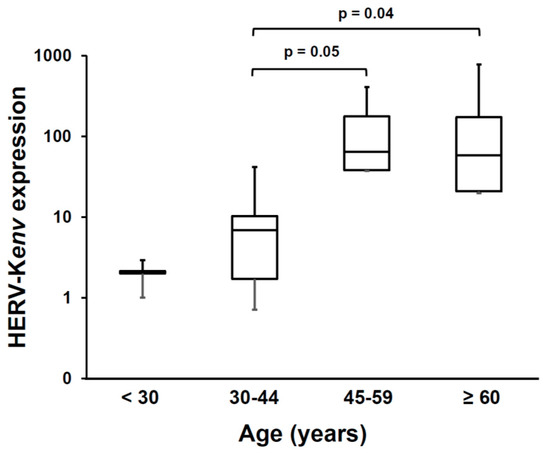 In evaluating data on HERVs, it must be pointed out that some caveat must be considered, due to the peculiarity of the study target. At variance with cellular genes, generally present in single copy/haploid genome, each HERV family is composed by multiple elements, largely similar each other in sequences, but slightly or largely different, for a wide variety of mutations and coding capacity, which may be dysregulated by epigenetic changes, inflammatory and environmental triggers. In this scenario, it is highly possible that “the” relevant HERV element is expressed at relatively low levels and masked by the bulk of expression, largely dysfunctional, of other elements of the same family. This implies that it is mandatory first to identify the relevant, functional, retroelement, and to create and validate selective assays. Functional transcripts can be enriched by processing polyA+ RNA, instead of total RNA, as done in almost all the studies of this Section, except ours, and to search also for the final protein, recognized by a specific antibody. Another major issue is the choice of the controls: since HERV-K has oncogenic potential and is activated in cancer, and these patients should not be considered equivalent to healthy controls. In this respect, no correlation of HERV-K levels with age or gender of non-ALS donors was found in total RNA of brain samples, [71,72]. Conversely, in plasma from healthy volunteers, as shown on Figure 4, we observed that the levels of HERV-K(HML-2)env polyA+ RNA increase significantly with the age of the donors.