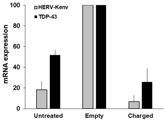 Levels of HERV-Kenv and TDP-43 mRNAs in LNCaP cells transfected either with the empty plasmid or with charged plasmid. The histograms represent the mean levels of HERV-Kenv and TDP-43 mRNAs, as detected by RT-qPCR, and are reported as percent of the value of mock-transfected cells in each experiment. Experimental conditions: Untreated cells, and cells either transfected with the empty plasmid, or with the plasmid charged with the Km3gRNA. For controls of specificity, methods and details, see [55].