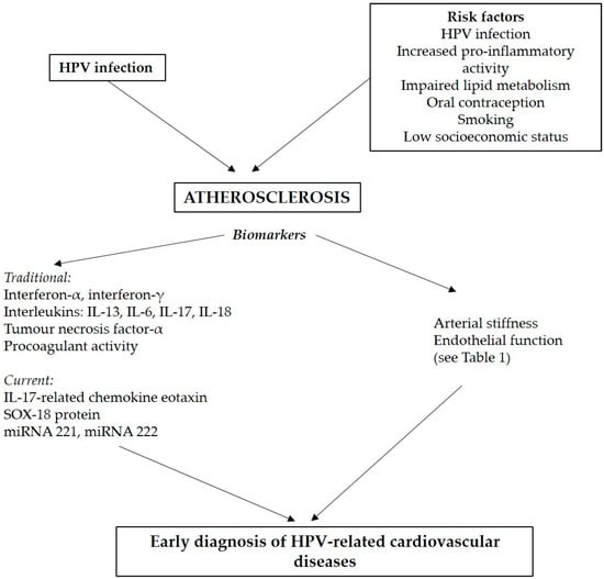 During recent decades, the progress in treatment has resulted in improved outcomes with a higher survival rate of patients with cervical carcinoma. Nowadays, emphasis is also put on the associated health problems and the potential side effects of treatment, particularly urogenital complications, bowel dysfunction, and psychosocial consequences, such as mood disorders, anxiety, and acute and posttraumatic stress disorder []. Paradoxically, much lower attention is drawn to the significantly increased risk of cardiovascular diseases (CVD), which may arise already before the diagnosis and consequent treatment. The issue of cardiovascular risk related to genital HPV infection, precancerous cervical conditions, and carcinoma represents an up-to-date topic which has been scarcely studied. The recently increased incidence of CVD in women infected with HR-HPV points towards an unclear understanding of the pathomechanisms, which may significantly affect the health of a large part of the population [,]. Accelerated atherosclerosis is assumed to play a key role in the pathophysiology of this relationship [,]. Therefore, the aim of this study is to summarise the current evidence on HPV-related CVD, to review potential direct and associated pathophysiological mechanisms including atherosclerosis, and to emphasise some of the most promising novel biomarkers which could be used in the personalised prevention of CVD in affected individuals.