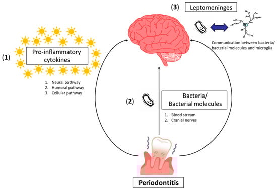 (1) Neuroinflammation can be caused by peripheral pro-inflammatory cytokines generated in systemic inflammation induced by periodontitis without the contact of periodontal bacteria/bacterial molecules with the brain tissue via three pathways, i.e., the neural pathway, the humoral pathway, and the cellular pathway. Through the neural pathway, systemic cytokines directly activate primary afferent nerves, such as the vagus nerve. The signal reaches the primary and secondary projection of the neural pathway, reaching first the nucleus tractus solitaries and subsequently, various hypothalamic brain nuclei []. It has been shown that subdiaphragmatic vagotomy blocks the LPS-induced sickness behavior in rats [], while it does not affect the LPS-induced synthesis of pro-inflammatory cytokines at the periphery. The humoral pathway involves the choroid plexus and circumventricular organs, which lack an intact blood–brain barrier (BBB). These leaky regions may be access points for circulating pro-inflammatory cytokines to enter into the cerebral parenchyma by volume diffusion and elicit downstream signaling events, which are important in altering brain function []. The cellular pathway implicates systemic inflammation in association with both activation of endothelial cells (CECs) and an increase in circulating monocytes []. Systemic pro-inflammatory cytokines activate CECs, expressing receptors for TNF-α and IL-1β, which in turn, signal to the perivascular macrophages located immediately adjacent to CECs []. These perivascular macrophages subsequently communicate with microglia and thus lead to microglial activation. Activated microglia secrete not only pro-inflammatory cytokines but also proteases and chemokines, including monocyte chemoattractant protein (MCP)-1. MCP-1 is supposed to be responsible for the recruitment of monocytes into the motor cortex, hippocampus, and basal ganglia regions, areas of the brain known to be involved in the control of behavior [].