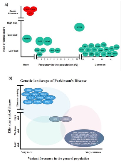 (a) Rare and common variants of AD genes and their risk. Red color signifies Mendelian genes, and green signifies non-Mendelian genes (adapted from []). (b) Rare and common variants of PD genes and their risk (adapted from []).