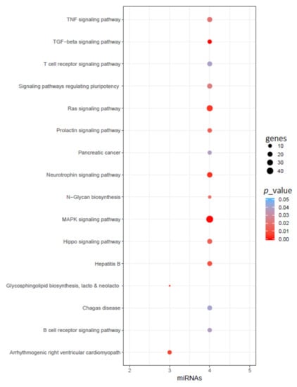 Functional enrichment of reported common miRNAs in AD and PD. Here, color represents the p-value of the pathway, size represents common gene targets of the pathway and miRNAs, and the x-axis represents the number of related miRNAs in that pathway.