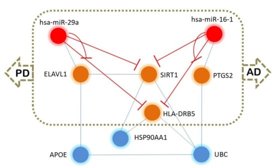 We analyzed the common 15 miRNAs using the TAM tool (http://www.lirmed.com/tam2/) [] with the upregulation option, and we observed six miRNAs (hsa-miR-181a, hsa-miR-29a, hsa-miR-29b, hsa-miR-29c, hsa-miR-146a, hsa-miR-148b) associated with Alzheimer’s disease and five miRNAs (hsa-miR-181a, hsa-miR-16, hsa-miR-29a, hsa-miR-29b, hsa-miR-29c) associated with Parkinson’s disease. Therefore, four miRNAs (hsa-miR-181a, hsa-miR-29a, hsa-miR-29b, hsa-miR-29c) are common to both diseases. We used the 15 common miRNAs and the common gene HLA-DRB5 identified from GWAS and analyzed using VisANT 4.0 (http://visant.bu.edu/) [] for any possible interactions and if there was an intermediate molecule. The analysis revealed that has-miR-29a and has-miR-16 regulate a common pathway associated with AD and PD. hsa-miR-16 interacts with PTGS2 (COX-2, encoded by the gene prostaglandin-endoperoxide synthase 2 (PTGS2)) gene, which is associated with both AD [,] and PD [,,,]. Similarly, the ELAV-like RNA binding protein 1 (ELAV1) interacts with hsa-miR-29a. ELAV1 is associated with AD [,], and ELAV1 is found to interact with SIRT1, which is also a marker and target in AD [,,]. UBC is associated with AD [] and integrates with PTGS2 and HLA-DRB5, which are associated with both AD and PD (Figure 3). Therefore, hsa-miR-29a, hsa-miR-16, ELAVL1, SIRT1, PTGS2, UBC, and HLA-DRB5 may form a hub that could be implicated in providing a common network for AD and PD. DAVID 6.8-based (https://david.ncifcrf.gov) [] functional analysis revealed that HLA-DRB5, PTGS2, and UBC are associated with Parkinson’s disease and that PTGS2 and SIRT1 are involved in Alzheimer’s disease. Further, ToppGene (https://toppgene.cchmc.org) [] analysis showed that SIRT1, UBC, HLA-DRB5, MIR29A, and PTGS2 are associated with PD. Therefore, PTGS2 and SIRT1 and their regulatory (immediate or distant) hsa-miR-29a and hsa-miR-16 are probably key molecules common for AD and PD pathogenesis. From these initial results, we tried to explore if the proteins of this hub (ELAVL1, SIRT1, PTGS2, UBC, HLA-DRB5) were also targeted by these two miRNAs (hsa-miR-29a and hsa-miR-16). We used miRWalk (http://mirwalk.umm.uni-heidelberg.de/) [] and miRDB (http://mirdb.org/) [], and we observed that SIRT1, ELAVL1, PTGS2, and HLA-DRB5 mRNAs are directly targeted by hsa-miR-16 and hsa-miR-29a/b/c. However, UBC was not found to be targeted by these two miRNAs. To further characterize the epigenetic functionalities of these two miRNAs, we used miRPathDB (https://mpd.bioinf.uni-sb.de) []. The miRNA hsa-miR-16 was found to be involved in histone modification, regulation of histone H3-K9 acetylation, positive regulation of histone H3-K9 methylation, positive regulation of histone H3-K4 methylation, regulation of the RNA metabolic process, and rRNA modification in the nucleus and cytosol. The hsa-miR-29 is also involved in pathways associated with histone H3-K4 demethylation, negative regulation of histone H3-K9 methylation, histone ubiquitination, DNA methylation and demethylation, and regulation of the RNA biosynthetic process. Therefore, these two miRNAs may modulate the common epigenetic mechanism behind AD and PD by multiple mechanisms.