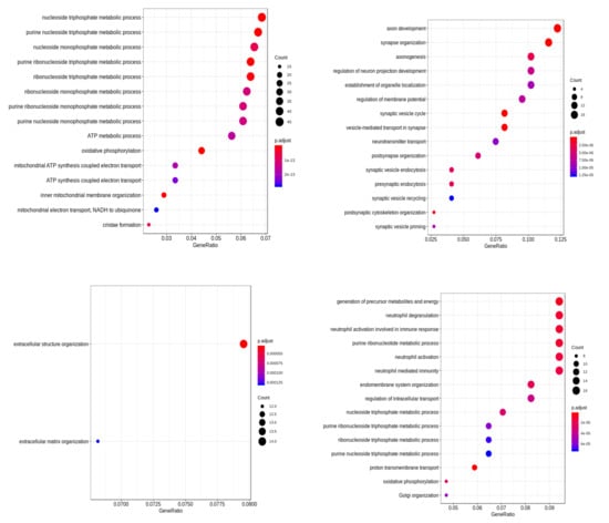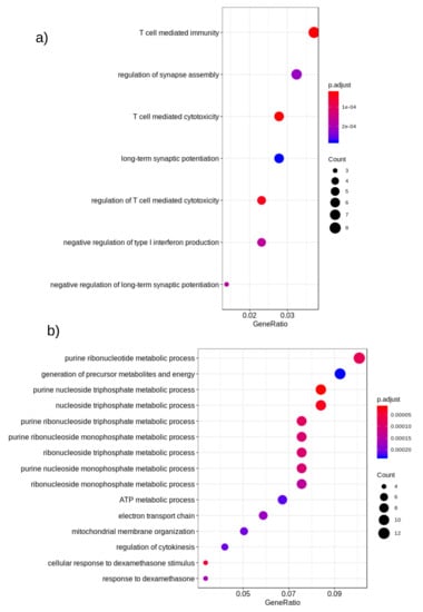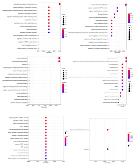 To get better insights into the genomic level similarity between AD and PD, we next used the gene expression data that were downloaded from the Gene Expression Omnibus (GEO) repository []. Next, we performed differential expression (DE) analysis on these datasets to identify the important genes in AD/PD. We found that out of the reported gene list, 38 genes were expressed in this dataset in AD, and 1444 genes were expressed in PD , as shown in Table 7. None of these DE genes were however reported in GWAS studies in AD patients. However, in PD, nine DE genes HIP1R, FAM171A1, BIN3, MAPT, RIT2, ALAS1, SH3GL2, ITPKB, and SNCA were reported in PD based on GWAS studies. Next, we performed a functional enrichment analysis on these DE genes. The enriched biological processes are shown in Figure 4.