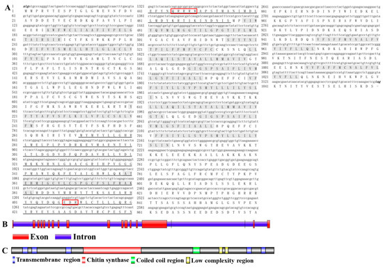 Bioinformatics analysis of Diaphorina citri chitin synthase (DcCHS). (A) Complete nucleotide and deduced amino acid sequence of the DcCHS cDNA. Numbers on the left side represent nucleotide and amino acid positions. The initiation codon (ATG) and termination codon (TAG) are indicated in black italics. The Chitin_synth_2 domain is indicated in a single line. (B) Gene structure analysis of DcCHS by using Splign online software. (C) Domain analysis of DcCHS by Illustrator for Biological Sequences (IBS) software.