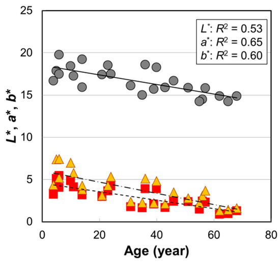 Similar to the case of Caucasian hair [7], it is generally recognized for Japanese hair that the hair color is sometimes brown in childhood but turns darker as children grow up. However, there was no information about how the color of pigmented hair changes after maturity. Commo et al. [11] reported a significant age dependence of hair tone level—assessed using a light color scale of 10 steps—not only in Caucasian hair (R2 = 0.18, p = 0.0012) but also in East Asian (Chinese) hair (R2 = 0.097, p = 0.020). In this study, for pigmented hairs of Japanese females, we found higher correlations with age (R2 = 0.53, p = 3.3 × 10−5 for L*, R2 = 0.65, p = 1.1 × 10−6 for a*, and R2 = 0.60, p = 5.6 × 10−6 for b*), and it was clearly seen that the hair color continued to be darker with age after pubertal age.