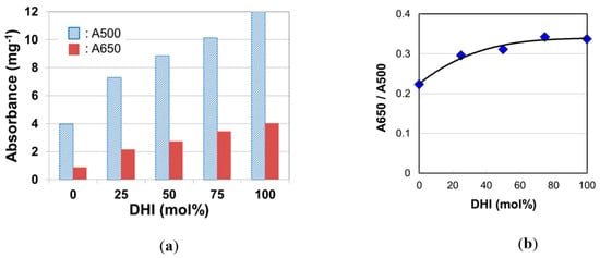 (a) The absorbance at the wave length of 500 nm (A500) and 500 nm (A650) of Soluene-350 solutions of melanins synthesized with various 5,6-dihydroxyindole (DHI) mol%. (b) Effect of DHI mol% on the absorbance ratio A650/A500. The data are averages from two independent analyses.