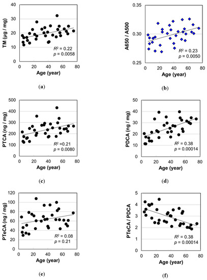 The age dependencies of various values measured by melanin analyses of Japanese female hairs. (a) Total melanin amount (TM). (b) Absorbance ratio A650/A500 for Soluene-350 solution of hair melanin. (c) Level of pyrrole-2,3,5-tricarboxylic acid (PTCA) in hair. (d) Level of pyrrole-2,3-dicarboxylic acid (PDCA) in hair. (e) Level of pyrrole-2,3,4,5-tetracarboxylic acid (PTeCA) in hair. (f) The ratio PTeCA/PDCA. The coefficient of determination and p-value are shown in each figure.