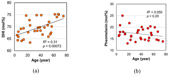 The age dependences of melanin components in Japanese female hairs. (a) DHI mol% in eumelanin of hair. (b) Pheomelanin mol% in hair. The coefficient of determination and the p-value are shown in each figure.