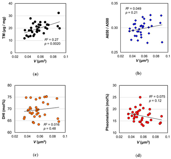 Figure 5 shows the correlations between the values determined by the melanin analyses and the mean melanosome volume. It was confirmed that TM was significantly higher as V became larger (Figure 5a) (R 2 = 0.27, p = 0.0020). On the other hand, there were no significant correlations between V and A650/A500 (Figure 5b), DHI mol% (Figure 5c), and pheomelanin mol% (Figure 5d). It should be noted that A650/A500, DHI mol%, and pheomelanin mol% are ratios in which changes are small, while TM is a value, and its change is large. The levels of PTCA, PDCA, PTeCA, and TTCA had more or less positive correlations with V (Figure S7). It was reasonable that these levels increased with melanosome volume. Both levels of PTCA (R2 = 0.25, p = 0.0032) and PDCA (R2 = 0.23, p = 0.0068) showed significant correlations with age (Figure S7a,b), while TTCA level did not (R2 = 0.065, p = 0.21) (Figure S7d). Therefore, the increase of TM in relation to the increase of V could be ascribed to the increases of eumelanin. It should be noted that eumelanin is much darker than pheomelanin [15].
