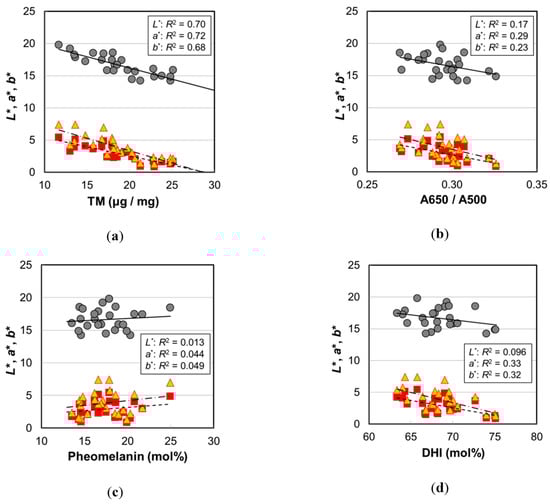 The hair color parameters (L*, a*, and b*) of the Japanese female hair samples plotted against various values measured by hair melanin analyses. Circles, L*; squares, a*; triangles, b*. Lines are the fitted curves. Solid lines, L*; dashed lines, a*; dot-and-dash lines, b*. (a) The color values vs. total melanin amount, p = 2.2 × 10−7 (L*), 1.0 × 10−7 (a*), and 3.9 × 10−7 (b*); (b) vs. A650/A500, p = 0.043 (L*), 0.0054 (a*), and 0.015 (b*); (c) vs. pheomelanin mol%, p = 0.59 (L*), 0.31 (a*), and 0.29 (b*); (d) vs. DHI mol%, p = 0.13 (L*), 0.0027 (a*), and 0.0032 (b*). The coefficients of determination are shown in each figure.