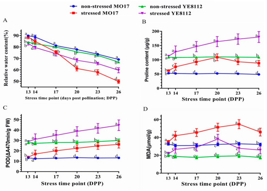 Physiological changes in the kernels of two contrasting maize inbred lines (sensitive MO17 and tolerant YE8112) in response to drought stress. Physiological changes were measured at different time points (13, 14, 17, 20, 23, and 26 days post pollination; DPP) under both water-sufficient (control) and water-deficit conditions. (A) Relative water content; (B) proline content; (C) peroxidase (POD) activity; (D) malonaldehyde (MDA) content. Data are presented as mean ± standard errors (n = 3). Different letters above line graphs show significant difference (p ≤ 0.05) among treatments at a given stress time point.