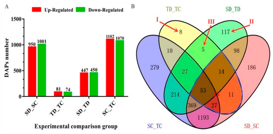 Analysis of differentially abundant proteins (DAPs) identified in four experimental comparisons. (A) Total number of DAPs identified in each experimental comparison group, by expression type. Up-regulated means DAPs with increased differential abundance. Down-regulated means DAPs with decreased differential abundance. (B) Venn diagram analysis of DAPs. Overlapping regions of the Venn diagrams indicate DAPs shared between or among corresponding groups. DAPs uniquely expressed in TC_TD (I), SD_TD (II), and TC_TD and SD_TD (III) are indicated with arrows. Area IV shows 105 overlapping DAPs within line.