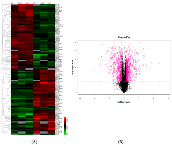 Clustering analysis of differentially abundant proteins (DAPs). (A) Heat map of DAPs overlapping in in SD_TD experimental comparison. Each row represents a significantly abundantly expressed protein. SD1-3 refers to the biological replicate number for MO17, whilst TD1-3 refers to the replicate number for YE8112. The DAPs were clustered based on the differentially expressed levels. The scale bar indicates the logarithmic value (log 2) expression of the DAPs, up-regulated (red) and down-regulated (green); (B) volcano plot showing the (log 2; −log 10 false discovery rate, FDR) expression of the DAPs in SD_TD comparison. Purple bubbles represent differentially expressed proteins and black bubbles represent proteins with non-differential expression.