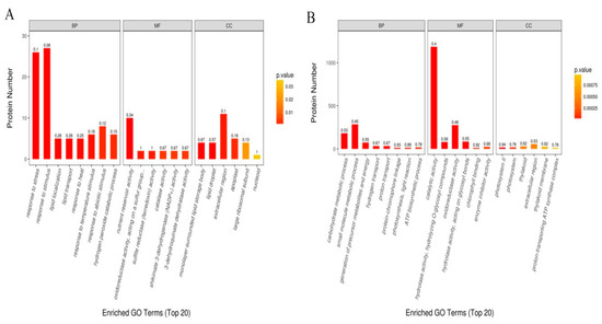 Gene ontology (GO) functional classification of differentially abundant proteins (DAPs). (A) Most significantly enriched GO terms (top 20) in tolerant line YE8112 under drought conditions; (B) most significantly enriched GO terms in sensitive line MO17 under drought conditions. The number above each bar graph shows the enrichment factor of each GO term (rich factor ≤ 1).