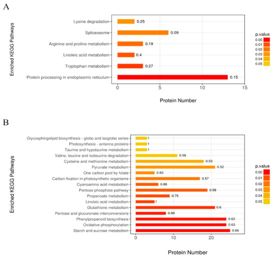 KEGG pathway enrichment analysis of the DAPs. (A) Most significantly enriched pathway in TD_TC; (B) most significantly enriched pathways in SD_SC, based on the hypergeometric test, p < 0.05. The color gradient represents the size of the p value; the color is from orange to red, and the nearer to red represents a smaller p value, and a higher significance level of enrichment of the corresponding KEGG pathway. The label above the bar graph shows the enrichment factor (rich factor ≤ 1).