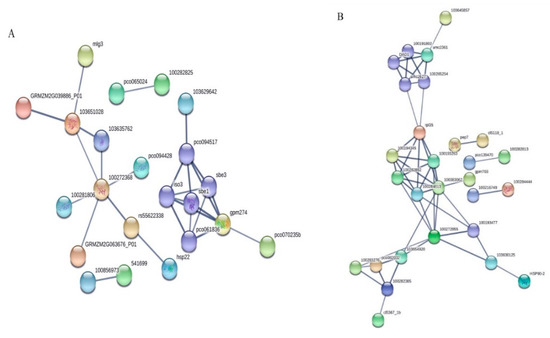 Protein–protein interaction analysis of the maize kernel drought-responsive differentially abundant proteins (DAPs). (A) DAPs differentially expressed in YE8112 after drought treatment (TC_TD). (B) MO17-specific DAPs. String database (version 10.5; http://www.string-db.org/) was used to construct the network. The nodes represent proteins, and the thickness of connectors between nodes represents the strength of the supporting data.