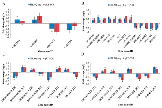 Quantitative real-time PCR (qRT-PCR) analysis results of the maize kernel drought-responsive genes encoding differentially abundant proteins (DAPs) from different experimental comparisons. (A) DAPs unique to TC_TD; (B) DAPs specific to SD_TD; (C) DAPs shared between SD_TD and TC_TD; (D) common or overlapping DAPs between TC_TD and SC_SD. All negative expression level values mean that the genes were down-regulated. GAPDH (accession No. X07156) was used as the house keeping gene. Error bars represent the SE (n = 3).
