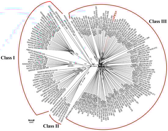 The coding sequence (CDS) of GsPRX9 from the wild soybean (G. soja) in this study was found to be identical to the sequence of Glyma.14g070800 from the soybean reference genome (https://phytozome.jgi.doe.gov/pz/portal.html), which is 1035 bp in length and encodes 344 amino acids with a peroxidase domain consisting of 247 amino acids. Phylogenetic analysis of soybean PRX9, together with the 159 seed sequences (with 201 to 350 amino acids in length) of the peroxidases protein superfamily (Table S1), was performed. According to the functional annotation (Table S2) and classification [8] of the peroxidases superfamily, these 160 proteins were grouped into three classes (Figure 1). GsPRX9 was classified into the Class III peroxidases (Prxs).