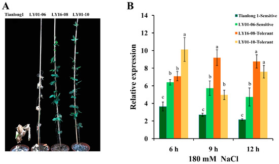 Soybean seeds, including salt-tolerant (“LY01-10”, “LY16-08”) and -sensitive varieties (“LY01-06”, “Tianlong1”), were obtained from the National Center for Soybean Improvement, Nanjing Agricultural University, Nanjing, China. Soybean seeds were germinated in sterile nutrient soil (turf + vermiculite + perlite, 2:2:1) and grown in a greenhouse for 12 days, at 28 °C (day)/24 °C (night) with 14 h (light)/10 h (dark) photoperiod, and the soybean seedlings were then subjected to 0 or 180 mM NaCl treatment.