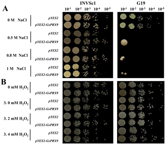 The growth characteristics of yeast (strains of INVSc1 and G19), containing pYES2-GsPRX9 plasmid or pYES2 empty vector, respectively, on a yeast extract-peptone–dextrose (YPD) medium with different concentrations of NaCl (0, 0.5, 0.8, and 1 M) or H2O2 (0, 3, 3.2, and 3.4 mM) were compared. There was no obvious difference between the yeast containing pYES2-GsPRX9 and the yeast with pYES2 empty vector on normal (0 M NaCl and 0 mM H2O2) YPD medium (Figure 3). The pYES2-GsPRX9-transformed INVSc1 yeast grew better than the pYES2 empty-vector-transformed INVSc1 yeast on a YPD medium containing 0.5 or 0.8 M NaCl (Figure 3A). In addition, when the salt-sensitive yeast mutant G19 was used, pYES2-GsPRX9-transformed yeast showed better growth than the pYES2 empty-vector-transformed G19 yeast on YPD containing 0.5, 0.8, or 1 M NaCl (Figure 3A). Under H2O2 stress, pYES2-GsPRX9-transformed yeast (strains of INVSc1 and G19) exhibited better growth than the pYES2 empty-vector-transformed yeast (Figure 3B). These results revealed that overexpression of GsPRX9 improved the tolerance of INVSc1 and G19 yeasts to NaCl and H2O2 stress.