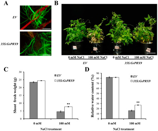 The salt tolerance evaluation of soybean hairy roots was performed according to previously published methods [3,62]. Seeds of salt-sensitive soybean variety “Tianlong1” were surface-sterilized and placed onto MS medium (pH = 6.5) for germination. The fully developed cotyledons were cut in half and incised with sterile scalpels, and then co-cultivated with A. rhizogenes K599 (containing pBinGFP4–GsPRX9 plasmid or pBinGFP4) on White solid medium (MDBio, pH = 5.8) for 15 days without light. Positive transgenic soybean hairy roots were identified by green fluorescence signals with a stereoscopic fluorescence microscope (Olympus DP72, Tokyo, Japan). The soybean cotyledons with all hairy roots shown as positives were then transferred to the White solid medium (MDBio, pH = 5.8) with 0 mM (control) and 150 mM NaCl containing 500 mg/L carbenicillin and 50 mg/L cefotaxime (Sangon Biotech, Shanghai, China) at 22 °C for 14 days. Root fresh weight was recorded at day 14 post-treatment. To regenerate positive transgenic roots, the soybean hairy roots with green fluorescence signals were selected and their root tips (3 cm in length) were cut, and then transferred onto White solid medium (pH = 5.8, including carbenicillin 500 mg/L and cefotaxime 50 mg/L) containing 0 or 150 mM NaCl. Roots were sampled at 24 h post-treatment for detection of the GsPRX9 gene expression. The positive hairy roots continued to grow until day 14, and the lengths of primary hairy roots were measured. Four biological replications were performed and at least three hairy roots were measured for each repeat.