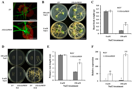 To further confirm the effect of GsPRX9 overexpression on salt tolerance of soybean, we transformed soybean cotyledons with A. rhizogenes K599 containing pBinGFP4-GsPRX9 plasmid or the empty vector pBinGFP4. After 14 days of 150 mM NaCl treatment, the soybean hairy roots overexpressing GsPRX9 showed better growth than the control (hairy roots transformed by the empty vector pBinGFP4; Figure 5A,B and Figure S2A–D). In comparison with the hairy roots transformed by the empty vector, the fresh weight of GsPRX9-overexpressing soybean hairy roots was significantly (p < 0.01 by t-test) higher under 150 mM NaCl treatment (Figure 5C and Figure S2E–H), while no significant difference (p > 0.05 by t-test) was observed under 0 mM NaCl conditions.