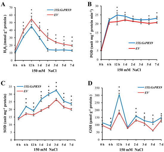 Effect of GsPRX9 overexpression on H2O2 content (A), POD activity (B), SOD activity (C), and GSH level (D) in transgenic soybean hairy roots under salt stress. EV represents soybean hairy roots with the empty vector pBinGFP4, and 35S:GsPRX9 represents roots with the recombinant vector pBinGFP4–GsPRX9 (GsPRX9 was expressed in fusion with GFP, driven by a CaMV 35S promoter). The content of hydrogen peroxide (H2O2), activity of peroxidase (POD), superoxide dismutase (SOD), and glutathione level (GSH) in soybean hairy roots were measured at 0 h, 6 h, 12 h, 1 d, 2 d, 3 d, 5 d, and 7 d after 150 mM NaCl treatment. Data represent the mean ± standard deviation of four biological replications and each repeat contained three independent transgenic hairy roots (n = 4 × 3 = 12). * and ** represents a significant difference between EV and 35S:GsPRX9 for each time point at the 0.05 or 0.01 level by Student’s t-test, respectively.