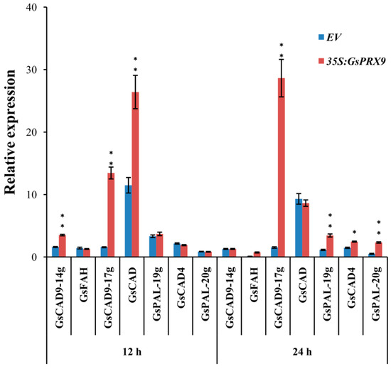 Although the regulation network of oxidative balance is complicated, H2O2 is known as the key signaling molecule [52]. GsPRX9 overexpressing soybean hairy roots can ultimately reduce the H2O2 content to protect soybean roots from ROS damage, probably through a complex antioxidant machinery in addition to the increased activities of SOD and POD, and the GSH level. It is interesting that, based on protein-protein interaction network analyses, GsPRX9 might interact with 10 other proteins (Figure S5), with five of them annotated as involved in the oxidation-reduction process (GO: 0055114) and two annotated as involved in the response to oxidative stress (GO: 0006979) (Table S3). The genes encoding these interacting proteins might be co-expressed with GsPRX9 at the transcriptional level. Therefore, we performed qRT-PCR to determine the relative expression of these seven genes that might be related to oxidation–reduction or response to oxidative stress, including four CAD (encoding cinnamyl-alcohol dehydrogenase) genes, two PAL (encoding phenylalanine ammonia-lyase) genes, and one FAH (encoding Ferulate-5-hydroxylase) gene. The relative expression level of GsCAD9-14g, GsCAD9-17g, and GsCAD at 12 h and GsCAD9-17g, GsPAL-19g, GsCAD4, and GsPAL-20g at 24 h after salt treatment in the roots of GsPRX9-overexpressing hairy roots showed a significantly greater increase than in hairy roots containing the empty vector (Figure 7). These results suggest that the overexpression of GsPRX9 increased the expression of other genes of soybean hairy roots in response to salt stress. Taken together, overexpression of GsPRX9 enhanced soybean salt tolerance through mediation of the ROS regulatory network.