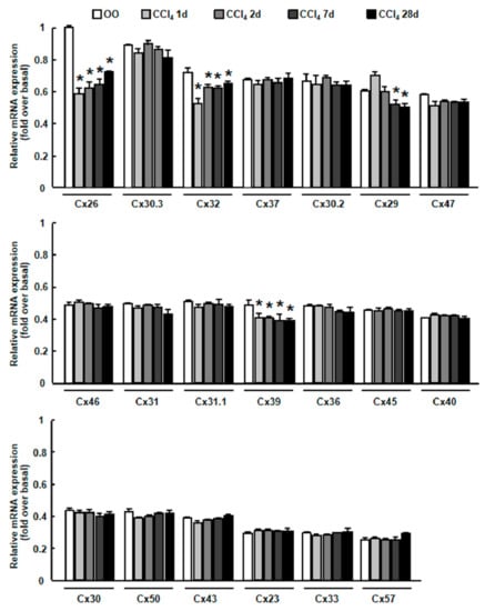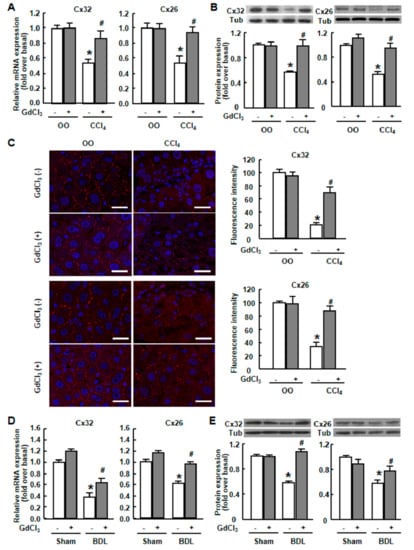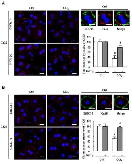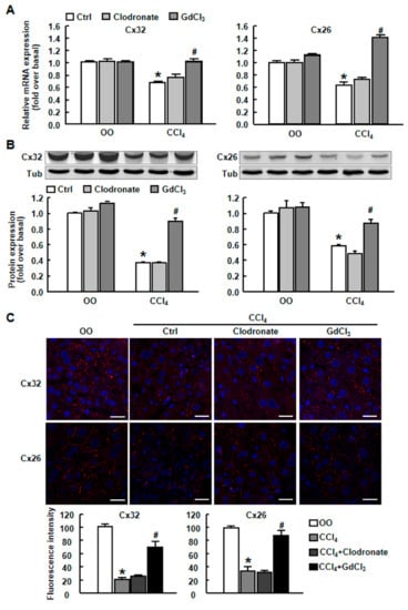 2.1. Cx32 and Cx26 Were Markedly Down-Regulated in Injured Liver
