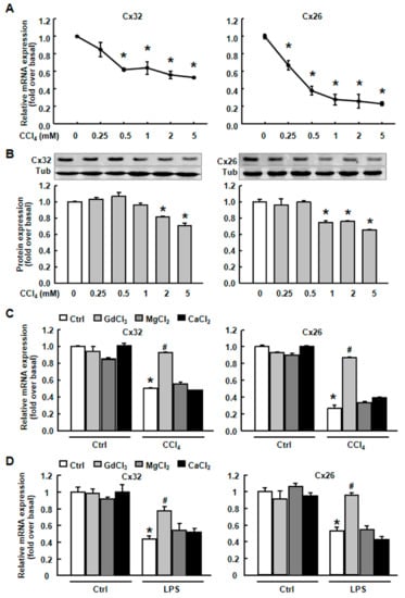 2.4. GdCl3 Prevented the Down-Regulation of Cx32 and Cx26 Induced by CCl4 or LPS in Primary Hepatocytes