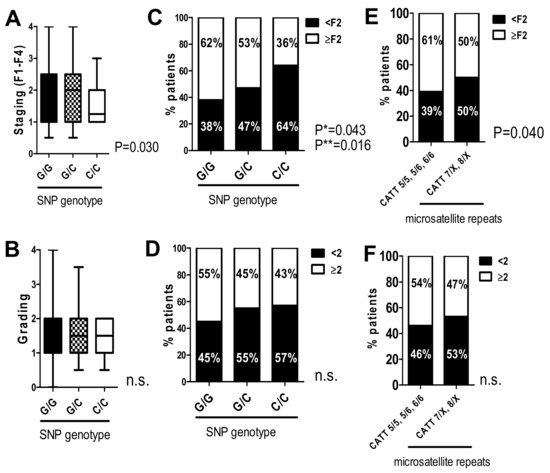 The C/C genotype in the -173 G/C-SNP and higher microsatellite repeat numbers in the CATT5–8 microsatellite significantly correlated with lower fibrosis stages in HCV-induced liver fibrosis. Only patients with fibrosis stage ≥F0.5 were included. (A) Correlation of the SNP genotype and fibrosis staging F1–F4 showed a significantly lower median fibrosis stage in patients with a C/C genotype compared to those with a C/G genotype (1.25 vs. 2.0) and G/G genotype (1.25 vs. 2.0, p = 0.030 in the Kruskal–Wallis test). (B) Histological grading did not significantly differ between the SNP-genotypes. (C) Proportions of patients with low or high fibrosis stages (<F2 vs. ≥F2) within the three SNP genotype subgroups. In the C/C subgroup, significantly more patients showed lower levels of fibrosis as Fisher´s exact test (*; p = 0.043) and linear-by-linear association test (**; p = 0.016) shows. (D) Histological grading did not significantly differ between the SNP-genotypes. (E) High repeat numbers on at least one allele of the microsatellite (“CATT 7/X; 8/X”) significantly correlated with lower fibrosis stages (p = 0.040). (F) There was no significant difference in the inflammatory activity of patients with low (“CATT 5/5, 5/6, 6/6”) to high repeat numbers. Data are expressed as the median ± range (A,B) or contingency (C,D–F) and were considered significant if p < 0.05 (*).