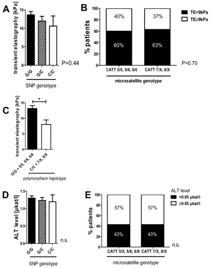 The C/C genotype of the -173 G/C SNP and higher microsatellite repeat numbers in the CATT5–8 microsatellite correlated with lower fibrosis stages in HCV-induced liver fibrosis in the HCV 2018 validation cohort. (A) Correlation of the SNP genotype and transient elastography (TE) results showed a tendency toward lower mean fibrosis measurements in patients with the C/C genotype compared the G/G genotype (p = 0.40). (B) High repeat numbers on at least one allele of the microsatellite (“CATT 7/X; 8/X”) did not significantly correlate with lower liver stiffness measurements. (C) The haplotype analysis of the G/G SNP genotype and low repeat numbers in the microsatellite (CATT 5/5, 5/6, 6/6) showed higher mean TE values than the C/C SNP genotype and high microsatellite repeat numbers (CATT 7/X, 8/X; p = 0.015). (D,E) Grading of the inflammatory activity based on levels of alaninaminotransferase (ALT) did not differ significantly between the SNP or microsatellite genotypes (patients were subgrouped by the ALT cutoff of 0.85 µkat/L). Data are expressed as the mean fibrosis level (A,C,D) or contingency (B,E) and were considered significant if p < 0.05 (*).