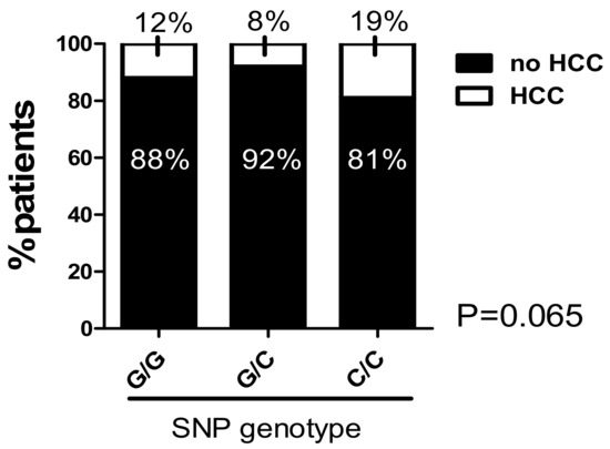 In addition to the severity of HCV-induced liver fibrosis and cirrhosis, we evaluated the impact of the MIF promoter polymorphisms on the prevalence of HCC in patients with HCV-induced liver disease. Here, we see that for both minor genotypes, the prevalence of HCC was increased. However, for both minor genotypes, statistical analysis did not reach the level of significance, even if there was a strong tendency for the “C/C” SNP genotype (p = 0.065; Figure 4) (for microsatellite genotypes, see Supplementary Figure S2; p = 0.58).