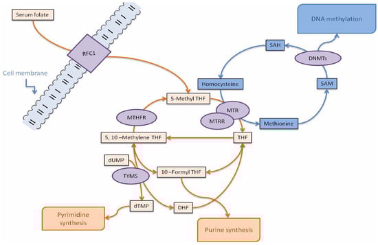 Simplified overview of the folate (orange color) and methionine (blue color) cycles in the one-carbon metabolism, adapted from []. The diagram illustrates the enzymes (violet color) whose polymorphisms have been investigated in this article, and their metabolites. Enzymes: DNMTs, DNA methyltransferases; MTHFR, methylenetetrahydrofolate reductase; MTR, methionine synthase; MTRR, methionine synthase reductase; RFC1, reduced folate carrier 1; TYMS, thymidilate synthase. Metabolites: DHF, dihydrofolate; THF, tetrahydrofolate; dTMP, deoxythymidine monophosphate; dUMP, deoxyuridine monophosphate; SAH, S-adenosylhomocysteine; SAM, S-adenosylmethionine.