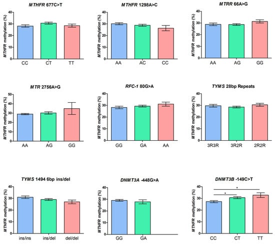 Correlation between one-carbon metabolism gene polymorphisms and MTHFR methylation levels. Data are expressed as means ± SEM. *Denotes a statistically significant difference after post-hoc Bonferroni’s correction for multiple testing (p < 0.05).