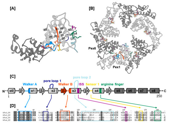 Pex1 and Pex6 belong to the broad superfamily of AAA+ ATPases (ATPases associated with diverse cellular activities; Figure 1). Their closest homologs are N-ethylmaleimide sensitive factor (NSF) and p97, which, like Pex1 and Pex6, belong to the classic clade of AAA+ ATPases (Figure S1) [20,21]. AAA+ ATPases are characterized by a structurally conserved ATPase domain, which comprises an α/β-Rossmann fold and a C-terminal α-helical subdomain [22] (Figure 1A–C). The central β-sheet of the α/β-Rossmann fold contains the conserved structural motifs Walker A, which coordinates the γ-phosphate of ATP during hydrolysis, and Walker B, which coordinates the water-activating magnesium ion for hydrolysis. The α/β-Rossmann fold further contains the conserved “second region of homology”, which harbors the sensor 1 motif and two arginine finger residues, as typical for the classic clade of AAA+ domains. Most AAA+ ATPases are only active in a hexameric assembly formed around a central pore (Figure 1B). Upon ATP hydrolysis, the hexamer can undergo significant movements and adopt circular or spiral arrangements [23,24,25,26,27]. For hydrolysis to take effect, the arginine finger of one ATPase domain reaches into the nucleotide binding pocket of the counterclockwise adjacent ATPase domain to interact with the bound nucleotide. Within the AAA+ ring or spiral, subunit contact is maintained by interactions between the α-helical subdomain and the α/β-Rossman fold of the clockwise adjacent ATPase domain. The hexamer is often further stabilized by association of affiliated N- or C-terminal domains. Most AAA+ ATPases remodel the substrate by threading it through the central pore to be unfolded in the process. Electron microscopy (EM) structures of several AAA+ complexes, such as Vps4 (Vacuolar protein sorting-associated protein 4) [26], NSF [28], ClpB [29], YME1 [30], VAT (valosin-containing protein-like ATPase of Thermoplasma acidophilum) [27], and p97 [25], present a hand-over-hand mechanism: The ATPase adopts a spiral conformation and makes its way along the substrates’ backbone hand-over-hand by sequential ATP hydrolysis. Thereby, the substrate is in contact with a spiral staircase of conserved aromatic residues that line the central pore. The conformation of these so-called pore loops is functionally coupled to ATP hydrolysis in the same AAA+ domain.