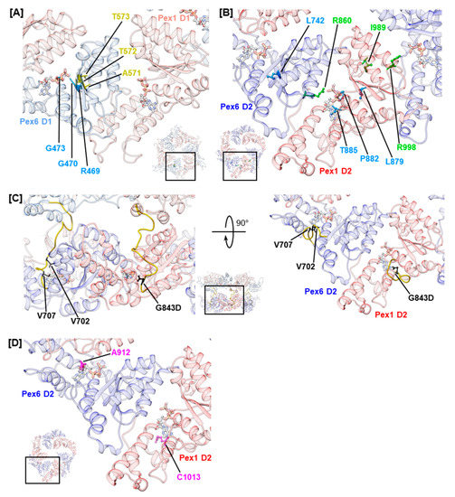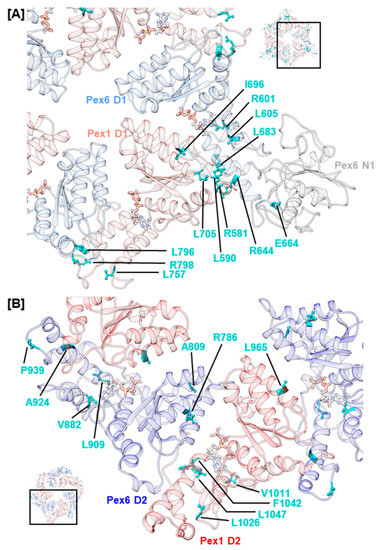 Interestingly, few mutations were uncovered, which concern the C-terminal part of α7 and α0 in the D2 ring of the Pex1/Pex6 complex (Figure 5B). One such mutation, hPex6.A924S (D2, α7), is classified as benign (ClinVar), though it concerns a surface-exposed residue in our model and alters hydrophobicity. Moreover, several benign variations were identified for the α-helical subdomain. These are hPex1.L757F (D1, α5–α6), hPex1.V1011M (D2, α5), hPex6.V882I (D2, α5), hPex6.A924S (D2, α7), and hPex6.P939Q (D2, α8). The remainder of mutations reported for the α-helical subdomain in Table 1 are expected to have fold-destabilizing properties based on their distinct localization and nature of the substitution. The mutations hPex1.L1026P (D2, α5–α6), hPex1.F1042V (D2, α6–α7), hPex1.L1047P (D2, α7), hPex6.L605R (D1, α5), hPex6.L683P (D1, α8), and hPex6.L909Q (D2, α6–α7), for example, concern hydrophobic residues whose sidechains are buried within the hydrophobic core of the α-helical bundle in our model. Besides the destabilizing effect introduced by the removal of the hydrophobic residue, the introduction of proline residues in helical segments generally disturbs the secondary structure and destabilizes them. The common founder mutation hPex6.R601Q (D1, α5) that is located within the second turn of α5 could also destabilize the α-helical subdomain, as buried polar residues provide fold-stabilizing hydrogen bond interactions with backbone atoms [79]. Its clinical significance is currently unclear, with two depositors attributing a benign nature while five other depositors considered this mutation to be pathogenic.