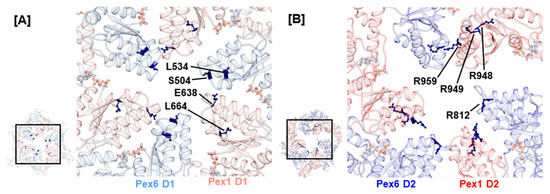 For the α-helical subdomain of the D1 domain of both Pex1 and Pex6, mutations are described that involve surface-exposed residues located at the C-terminal end of α7, which packs against α0 of the adjacent monomer. The mutations, namely hPex1.L796P (D1, α7), hPex1.R798G (D1, α7–α8), hPex6.R644W (D1, α7), and hPex6.E664D (D1, α7–α8), alter the charge at the interaction surface in our model and possibly hamper the interaction between the peroxins (Figure 5A). Mutations hPex1.R798G and hPex6.E664D are both located at the loop region succeeding α7 and might have a fold-destabilizing effect as the conformation of loops can be stabilized by electrostatic interactions. Our model suggests respective interactions between hPex1.R798 and hPex1.D813 (D1, α8) as well as hPex6.E664 and hPex6.K651 (D1, α7–α8) or hPex6.N652 (D1, α7–α8). The expression of hPex1.R798G in Pex1-deficient fibroblasts led to approximately 50% peroxisome-positive cells [14]. A temperature-dependent phenotype was also demonstrated on fibroblasts from a heterozygous patient displaying a G843D/ R798G Pex1 genotype. After staining with anti-catalase or anti-SKL antibodies, punctuate signals were evident in 83% and 91% of fibroblasts after cultivation at 30 °C, respectively. Thus, mutation hPex1.R798G was suggested to impact protein folding. It should be noted that this phenotype may also relate to mutation hPex1.G843D [14]. Furthermore, mutations that concern helix α0 of Pex1 D1, such as hPex1.R581P (D1, α0) and hPex1.L590R (D1, α0), have been reported. The pathogenic nature of mutation hPex1.R581P, which is expected to destabilize α0, has been demonstrated in a complementation assay. Only 23% of Pex1-deficient fibroblasts that expressed hPex1.R581P alongside pEGFP-SKL displayed punctuate signals that represented peroxisomes [3].