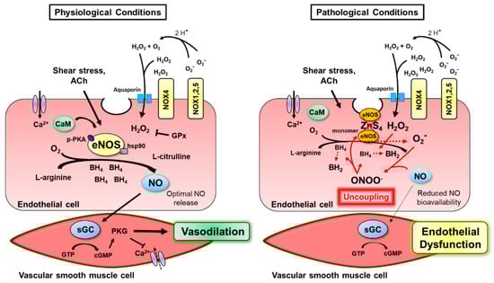 It is important to note that while eNOS is a critical factor in maintaining vascular function, eNOS uncoupling is associated with pathological conditions. That is, eNOS is “uncoupled” from the production of NO and instead generates superoxide (Figure 1). In turn, superoxide rapidly combines with NO to form the reactive nitrogen species (RNS), peroxynitrite (ONOO−) [], thus reducing the bioavailable NO. Notably, the reaction between NO and superoxide occurs at a rate three times faster than the enzymatic reduction of superoxide by superoxide dismutase (SOD) [], indicating that cytosolic superoxide concentrations have significant implications for endothelial dysfunction. ONOO− is considered a highly reactive oxidant with the ability to cause several cellular derangements, including apoptosis and nitration of tyrosine residues []. Increased ONOO− levels can subsequently generate a wide array of negative reactions associated with eNOS uncoupling, such as oxidation of BH4 [], iron-sulfur centers [], and the ZnS4 core of eNOS []. Oxidation of the ZnS4 core results in monomerization of eNOS and inhibition of NO production. As a result, the negative by-product of eNOS uncoupling, ONOO−, has the ability to exacerbate the dysfunctional NO production. Depletion of BH4 is considered a primary mechanism involved in eNOS uncoupling and is observed in the presence of oxidative stress []. Superoxide and ONOO− can both catalyze the oxidation of BH4 to dihydrobiopterin (BH2), effectively limiting substrate availability for eNOS activation. The causative role of BH4 depletion in endothelial dysfunction can be demonstrated by restored endothelium-dependent dilation with overexpression of the BH4 rate-limiting enzyme, guanosine 5′-triphosphate cyclohydrolase 1 (GTPCH1) in apolipoprotein E knockout (ApoE KO) mice []. Additionally, BH4 treatment can partially restore eNOS dimerization in the presence of ONOO−, while oxidized BH4 causes a loss of eNOS activity []. These observations indicate that suboptimal levels of BH4 ultimately prevent NO production, while ONOO− catalyzes the oxidation of BH4 and disrupts the eNOS dimer. Thus, the dysregulation of eNOS activation results in a harmful cycle of ROS production, where eNOS itself is considered a direct source of ROS. Given that NOX are a major source of superoxide in the endothelium, it can be expected that NOX contribute to eNOS uncoupling (Figure 1). This relationship between NOX and uncoupling of eNOS will therefore be addressed in Section 4 of this review.