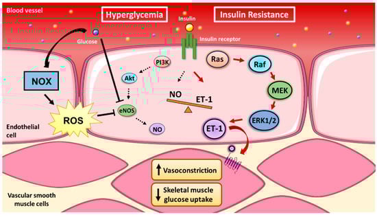 The observations of divergent insulin signaling pathways yield important insights into the mechanisms that underlie aberrant endothelial function and the subsequent metabolic impairments. The counterbalance between eNOS and MAPK signaling is consequently being investigated to determine links between CVD and T2D, with ET-1 acting as an important molecule regulating the development of both diseases (Figure 2).