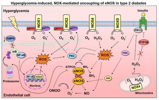 Endothelial dysfunction refers to the diminished ability of the endothelium to perform physiological actions of vasodilation, vascular permeability, and maintenance of vessel tone. Compromised endothelial function is observed in people with insulin resistance and metabolic syndrome, often preceding the onset of disease by several years. In T2D patients, the primary metabolic characteristic is chronically elevated blood glucose, although it is generally accepted that inflammation and oxidative stress are other prominent features []. The exposure of endothelial cells to hyperglycemia results in an array of negative effects that compromise vascular function; hyperglycemia is therefore considered a major candidate in the development of endothelial dysfunction in T2D. Accumulation of ROS, advanced glycation end products (AGEs), and altered cell signaling are just a few of the negative byproducts associated with hyperglycemic conditions. Among these endothelial cellular events triggered by high blood glucose, NOX are key players involved in mediating eNOS uncoupling and potentiating oxidative stress.