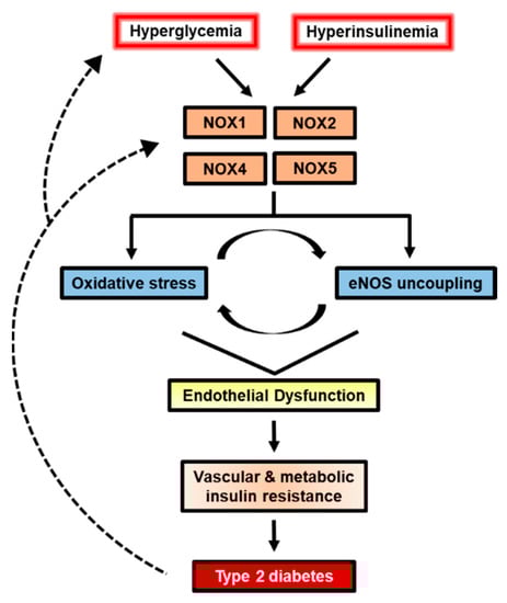 Endothelial dysfunction in type 2 diabetes. Increased NOX activation in settings of type 2 diabetes leads to several vascular and metabolic impairments. Hyperglycemia and hyperinsulinemia are major stimuli of endothelial NOX activation, which contributes to a cytotoxic cycle of oxidative stress and eNOS uncoupling. The altered redox environment subsequently reduces the ability of insulin to perform vasodilatory and glucose transport actions, rendering an essential decrement of endothelial function. Based on human studies, endothelial dysfunction precedes the development of type 2 diabetes, and animal models of type 2 diabetes demonstrate that experimental manipulation of NOX is an effective strategy to mitigate endothelial dysfunction and insulin resistance.