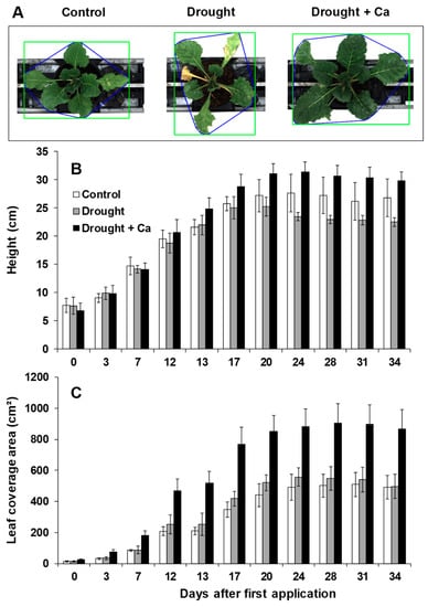 3.1. Foliar Application of Ca2+ Increases Mg and Si Levels in Leaves and Promotes Plant Growth, Height, Leaf Coverage Area Parameters under Drought Stress