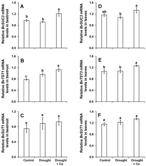 2.3. Foliar Application of Ca2+ Increased the Concentration of Sugars in Beetroot and Leaves Exposed to Drought Stress and Induced the Expression of the Genes Involved in Sugar Transport